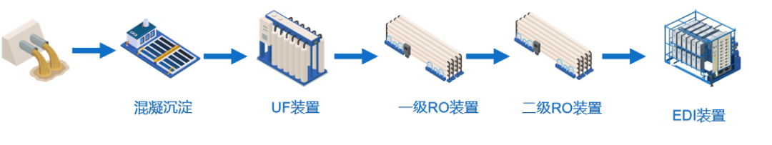 凝聚、澄清、过滤后的水→超滤系统→反渗透系统→混床系统。