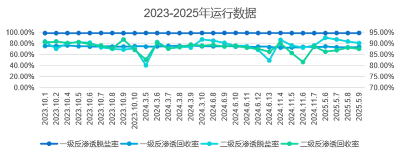 持续投运2.5年,一级反渗透脱盐率稳定在98%以上,二级反渗透产水电导率低于2.5μs/cm。