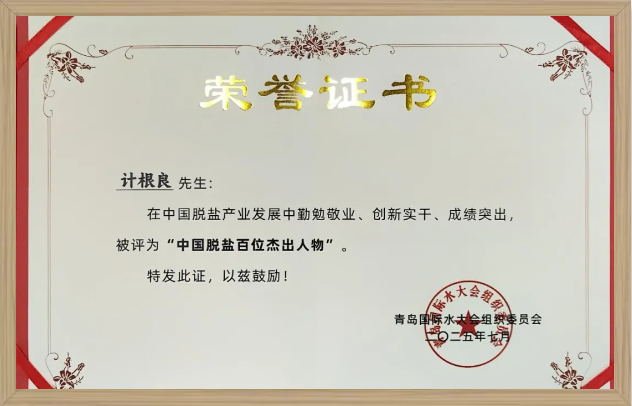 在大会同期举办的"中国脱盐产业发展20周年颁奖盛典"上,水艺膜科技总经理计根良博士荣膺 "中国脱盐百位杰出人物" 称号。此项荣誉不仅是对其引领行业技术革新的高度认可,更是对水艺膜在产品品质管控与技术突破方面持续深耕的权威见证。