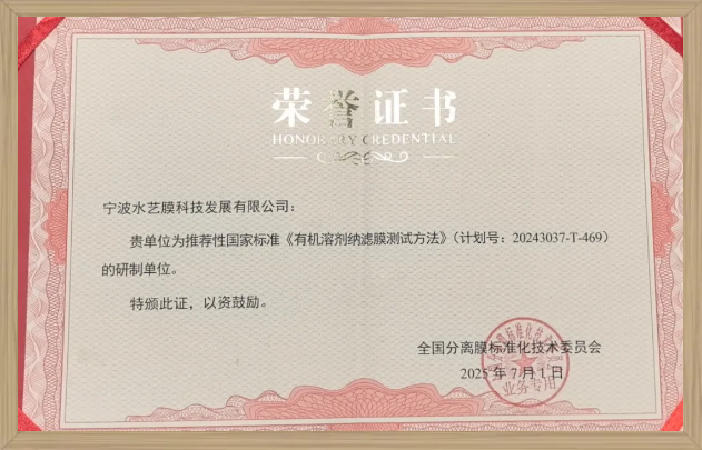 同期,作为推荐性国家标准《有机溶剂纳滤膜测试方法》的核心研制单位,水艺膜科技获全国分离膜标准化技术委员会颁发的荣誉证书,彰显了水艺在标准化建设领域的突出贡献。